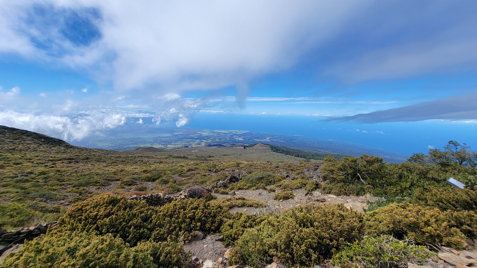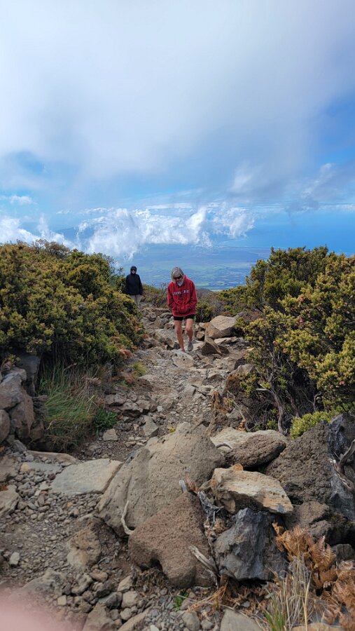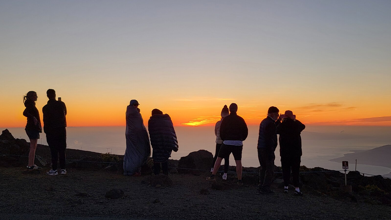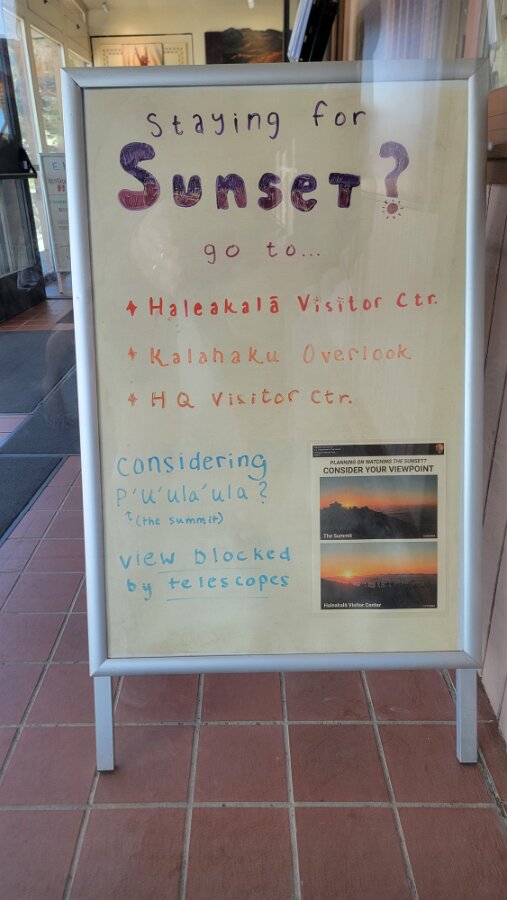After breakfast we got ready to snorkel. Rod tried to fixhis camera... [and Rod got really mad at his stupid camera ☹]We left a bit after 9:00. Drove past a bunch of resorts, passed some big homestoo to PalaueaBeach [aka White Rock]. Found a parking spot easily! 😊 Beautiful beach. There were a lot of people there but it didn't seem crowded. Swamaround for about an hour. It was hard to keep track of Rod. I think his weightbelt kept him lower when he was on the surface. Anyhoo… we couldn't see him ☹.Nora and I headed in a bit. Rod saw us and came in. The coral was reallybleached, saw fish but no turtles ☹. We did hear whales under the water. Rod caught thesound on video. Back to our place for lunch and a rest, then, up the mountain.Drove up Haleakalā. We stoppedat the visitors center first. A ranger told rod the best place to see thesunset was the parking lot of the Upper Visitors Center. The center was closed,but the potty was open. A long, twisty drive up the mountain. The observationarea at the top was beautiful! Windy& cold tho! Back down at the Haleakala Visitors Center we went on a shorthike. Great views. Had a snack & rest in the car. Sunset was at 6:39.Beautiful! Down the mountain in the dark! Leftover burgers for Nora & me.Rod had a croissant.