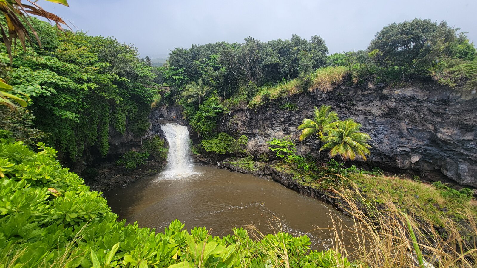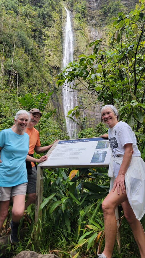 The Road to Hana!We got up early to get on the road! Took yogurt & granola with us to eatlater & caffeine! Hit the road at 7:00. Stopped at Costco to fill up withgas, then we were really on our way. We had a great drive! Not too muchtraffic. The road was not as crazy as our trip around the other half of Maui.Beautiful views & lots of water falls. There is very little parking by thefalls. Lots of “No Parking” signs. People are also not supposed to swim! It hasbeen a bit rainy so the water was really rushing! We planned to have our yogurtat the YMCA Camp, but we couldn’t find it. Close to where we though the Y was,we found Ke’anaePark. It was great! Beautiful views & a restroom! There were lots oftour vans there. Nora asked a guide about the Y camp. It is closed! We keptdriving thru Hana up to a Congregational Church where Charles Lindberg isburied! Beautiful spot. Big banyan tree in front of the church. We went back tothe HaleakalaPark Visitors Center at the SevenSacred Pools. Set off on what we thought would be a short hike. In therain! Did a loop to see the ocean & pools, then on to view the waterfall.At a sign along the way it said it was 2 miles to WaimokuFalls. After a brief discussion we forged on (of course). Saw another bigbanyan along the way. It was humid & occasionally rainy. The falls werespectacular! 400 ft! a great hike! 4.6 miles. Had lunch near the parking lot…thenit started to rain! Headed home. Uneventful drive. Went to Long’s for suppliesbefore going to the condo. I finished up the chicken soup by adding ourleftover veggie, pasta & chicken stuff along with the cauliflower rice webought. Late dinner & sleep!