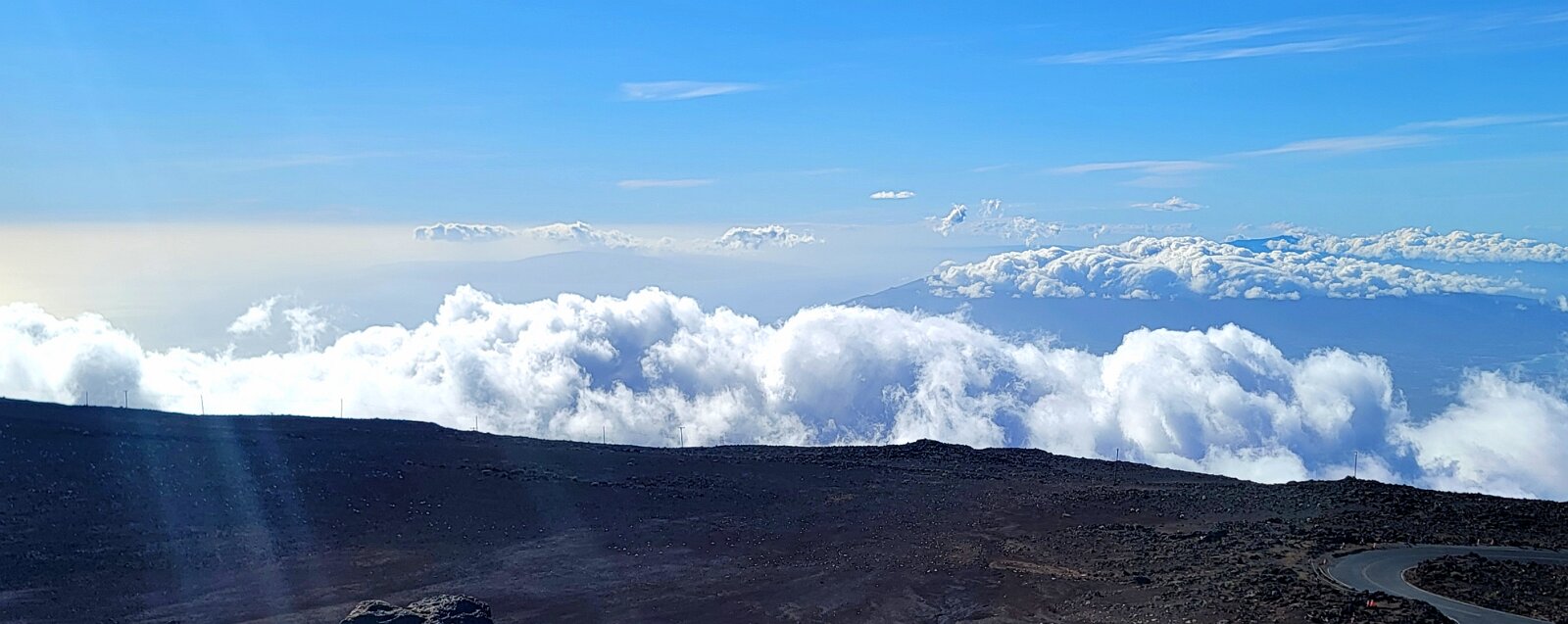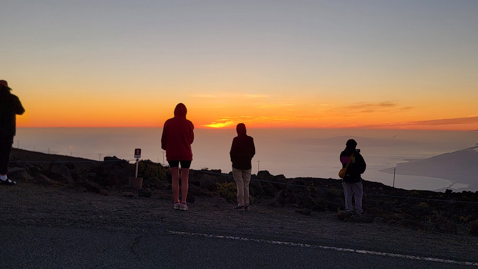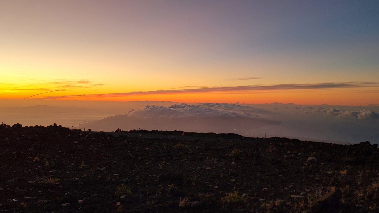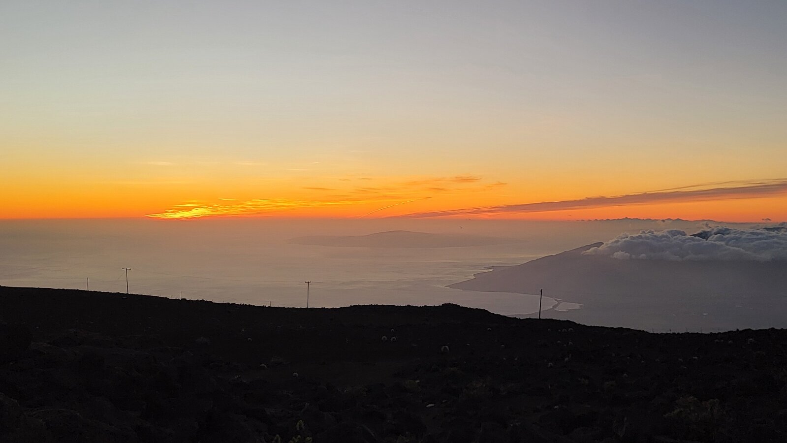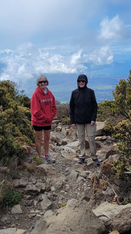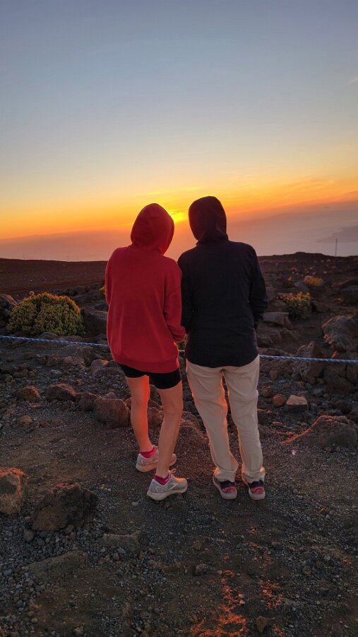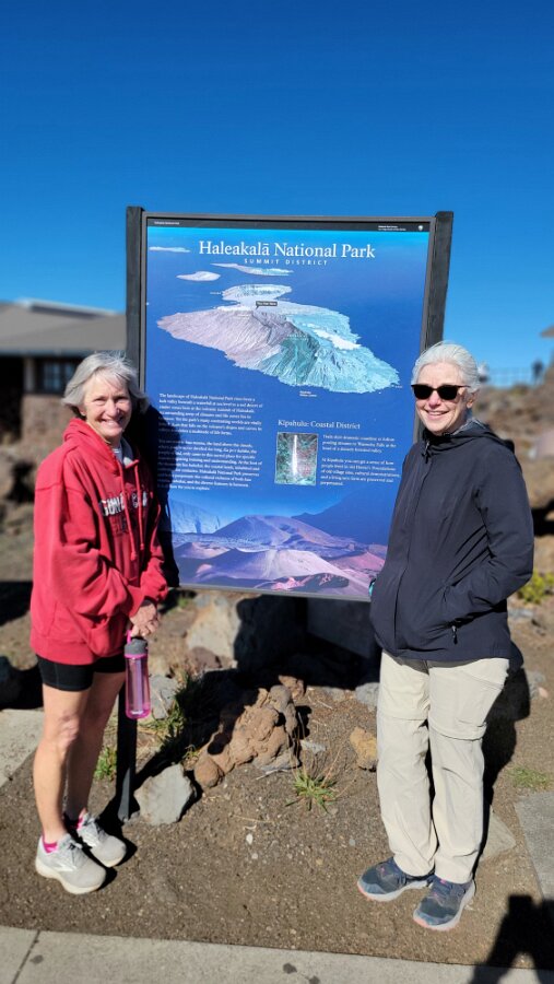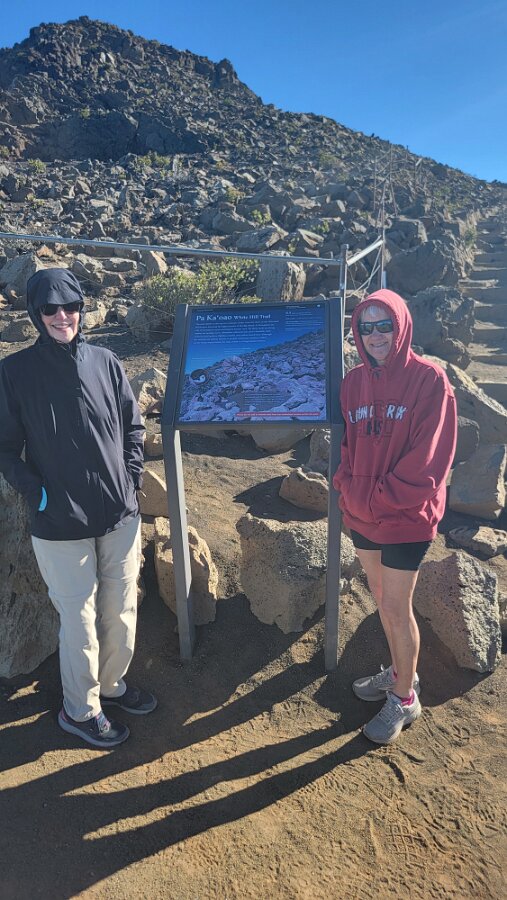 After breakfast we got ready to snorkel. Rod tried to fixhis camera... [and Rod got really mad at his stupid camera ☹]We left a bit after 9:00. Drove past a bunch of resorts, passed some big homestoo to PalaueaBeach [aka White Rock]. Found a parking spot easily! 😊 Beautiful beach. There were a lot of people there but it didn't seem crowded. Swamaround for about an hour. It was hard to keep track of Rod. I think his weightbelt kept him lower when he was on the surface. Anyhoo… we couldn't see him ☹.Nora and I headed in a bit. Rod saw us and came in. The coral was reallybleached, saw fish but no turtles ☹. We did hear whales under the water. Rod caught thesound on video. Back to our place for lunch and a rest, then, up the mountain.Drove up Haleakalā. We stoppedat the visitors center first. A ranger told rod the best place to see thesunset was the parking lot of the Upper Visitors Center. The center was closed,but the potty was open. A long, twisty drive up the mountain. The observationarea at the top was beautiful! Windy& cold tho! Back down at the Haleakala Visitors Center we went on a shorthike. Great views. Had a snack & rest in the car. Sunset was at 6:39.Beautiful! Down the mountain in the dark! Leftover burgers for Nora & me.Rod had a croissant.