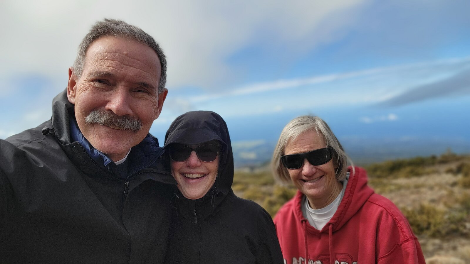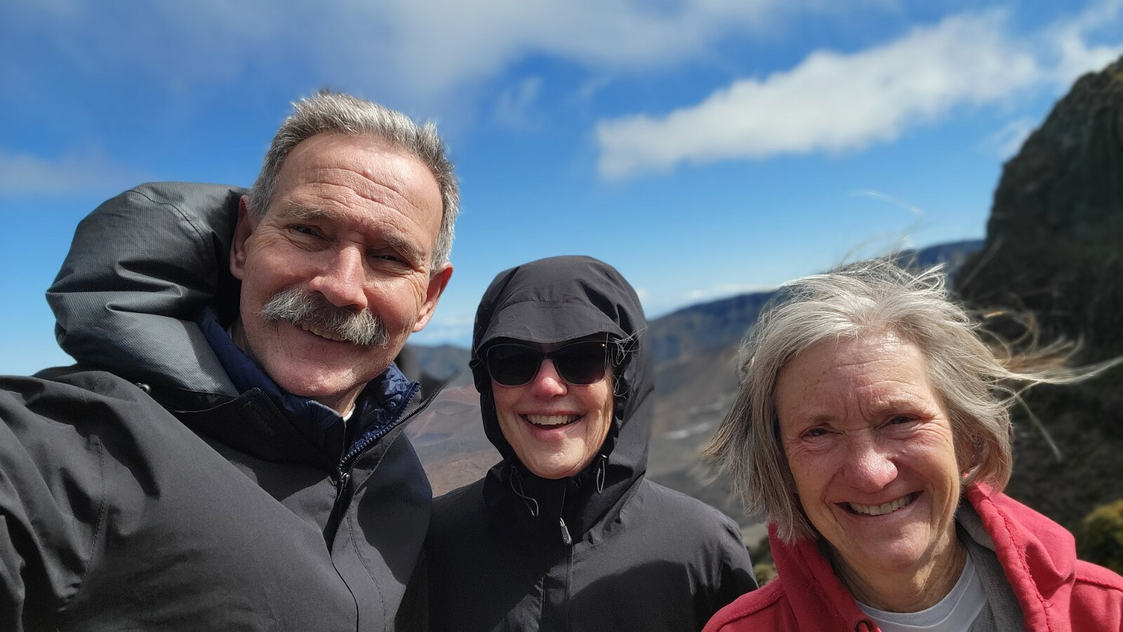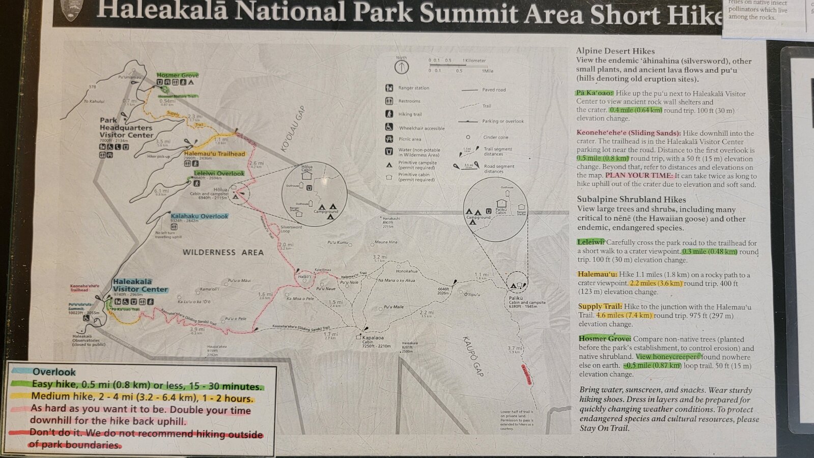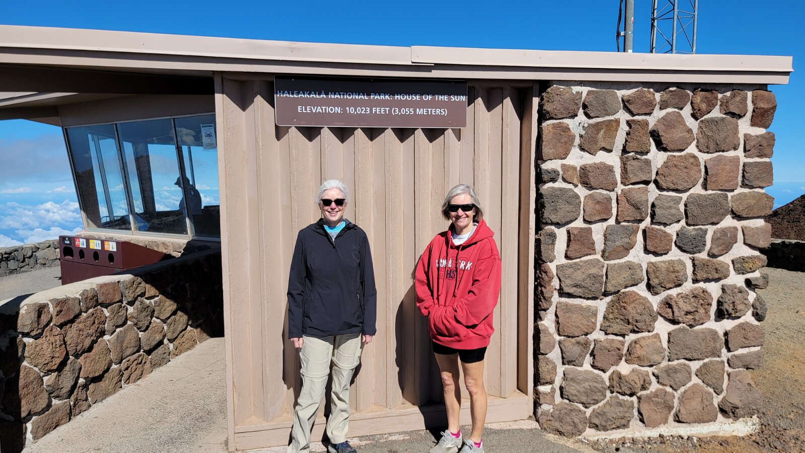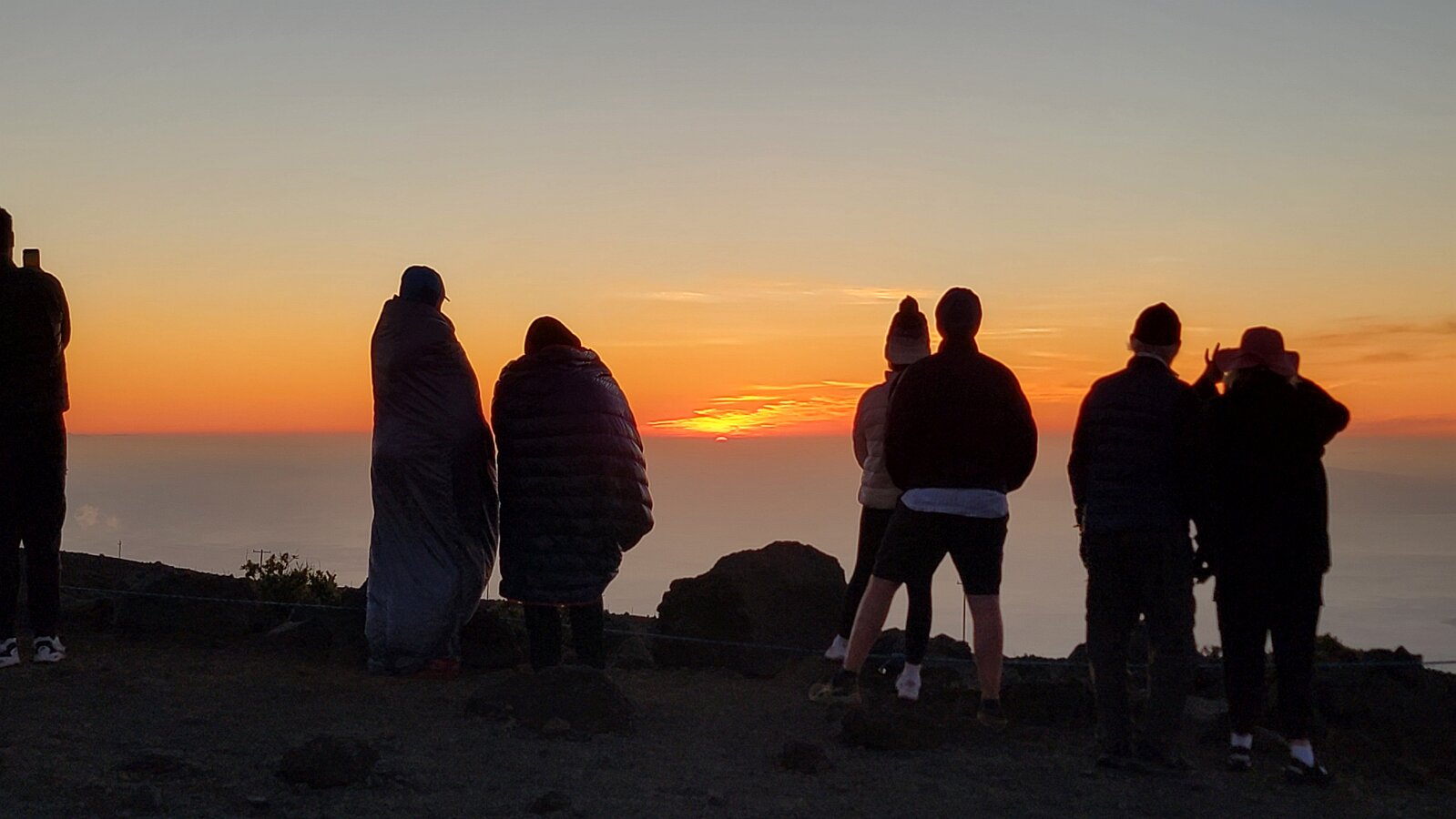 After breakfast we got ready to snorkel. Rod tried to fixhis camera... [and Rod got really mad at his stupid camera ☹]We left a bit after 9:00. Drove past a bunch of resorts, passed some big homestoo to PalaueaBeach [aka White Rock]. Found a parking spot easily! 😊 Beautiful beach. There were a lot of people there but it didn't seem crowded. Swamaround for about an hour. It was hard to keep track of Rod. I think his weightbelt kept him lower when he was on the surface. Anyhoo… we couldn't see him ☹.Nora and I headed in a bit. Rod saw us and came in. The coral was reallybleached, saw fish but no turtles ☹. We did hear whales under the water. Rod caught thesound on video. Back to our place for lunch and a rest, then, up the mountain.Drove up Haleakalā. We stoppedat the visitors center first. A ranger told rod the best place to see thesunset was the parking lot of the Upper Visitors Center. The center was closed,but the potty was open. A long, twisty drive up the mountain. The observationarea at the top was beautiful! Windy& cold tho! Back down at the Haleakala Visitors Center we went on a shorthike. Great views. Had a snack & rest in the car. Sunset was at 6:39.Beautiful! Down the mountain in the dark! Leftover burgers for Nora & me.Rod had a croissant.