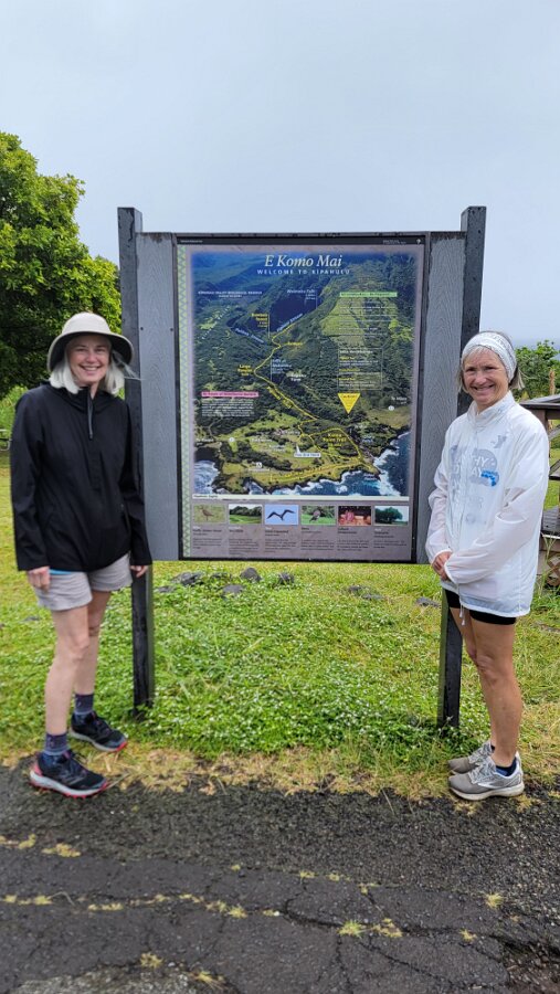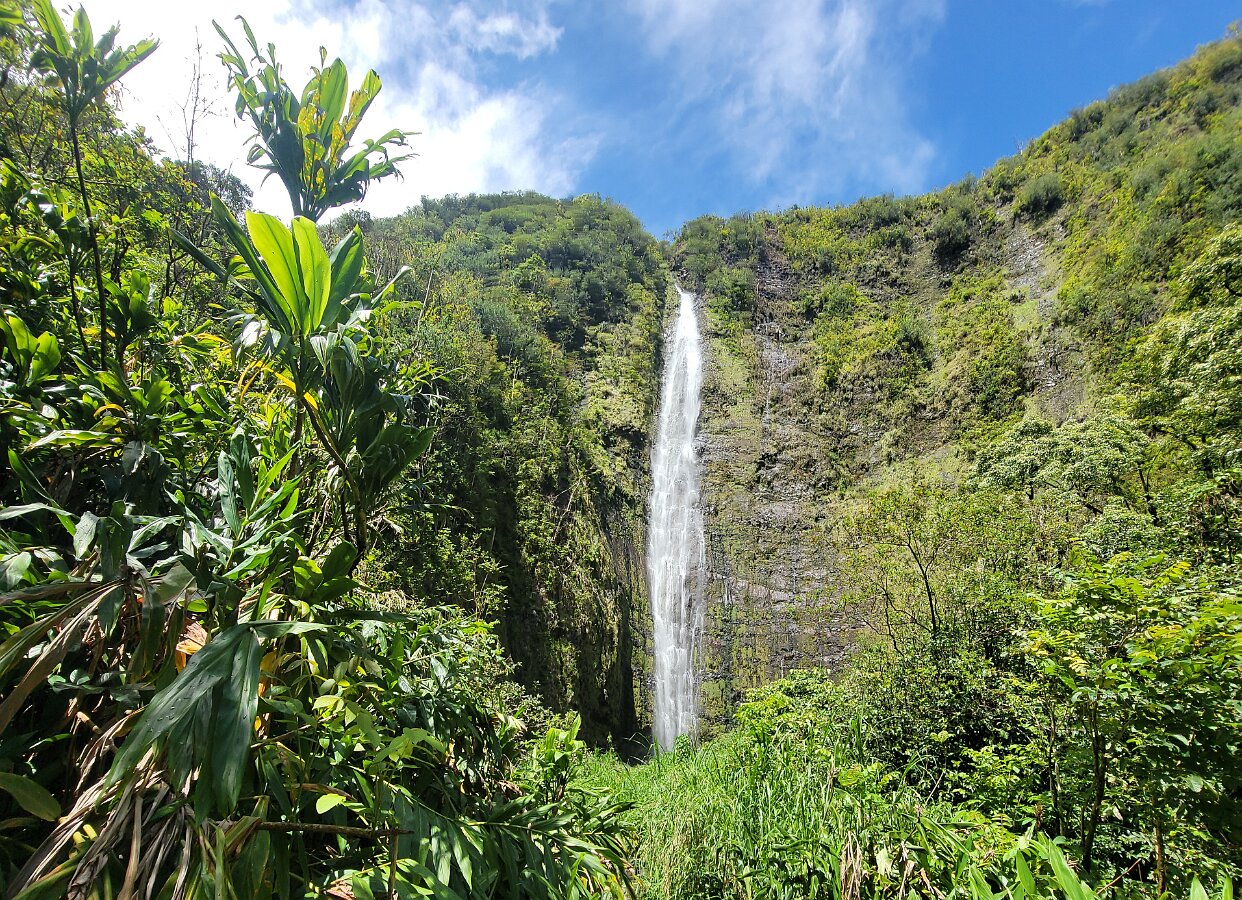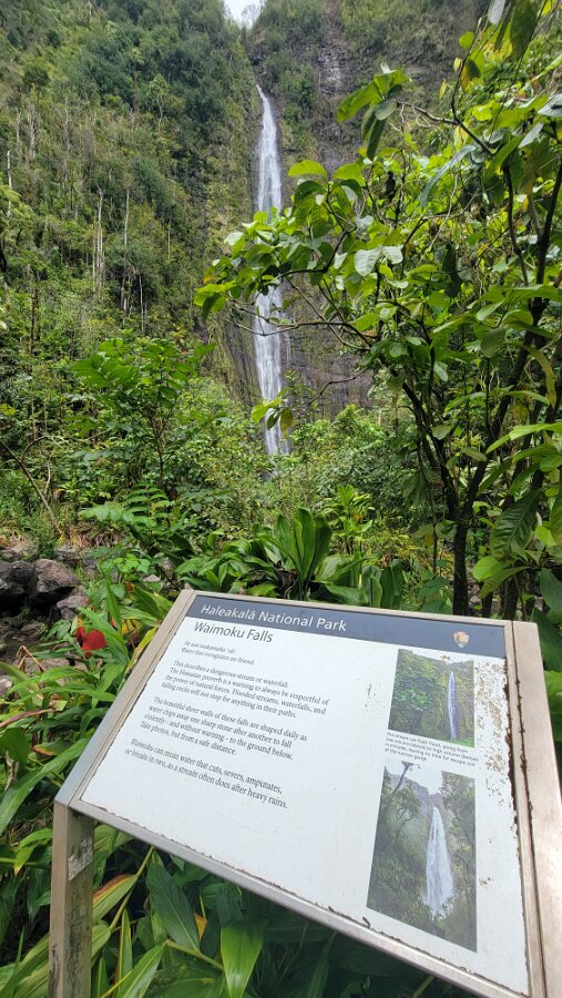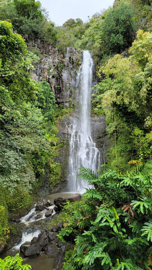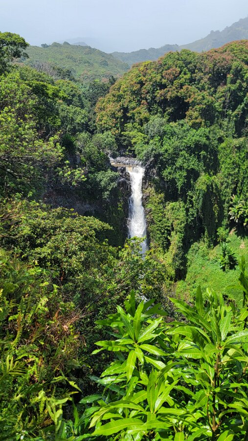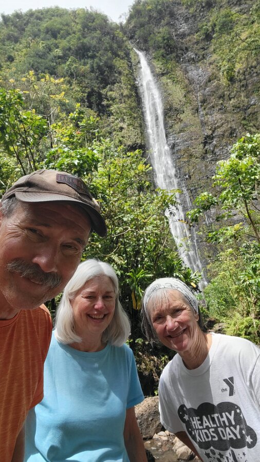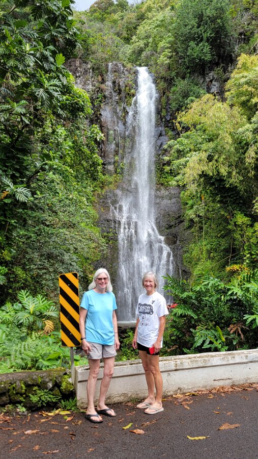 The Road to Hana!We got up early to get on the road! Took yogurt & granola with us to eatlater & caffeine! Hit the road at 7:00. Stopped at Costco to fill up withgas, then we were really on our way. We had a great drive! Not too muchtraffic. The road was not as crazy as our trip around the other half of Maui.Beautiful views & lots of water falls. There is very little parking by thefalls. Lots of “No Parking” signs. People are also not supposed to swim! It hasbeen a bit rainy so the water was really rushing! We planned to have our yogurtat the YMCA Camp, but we couldn’t find it. Close to where we though the Y was,we found Ke’anaePark. It was great! Beautiful views & a restroom! There were lots oftour vans there. Nora asked a guide about the Y camp. It is closed! We keptdriving thru Hana up to a Congregational Church where Charles Lindberg isburied! Beautiful spot. Big banyan tree in front of the church. We went back tothe HaleakalaPark Visitors Center at the SevenSacred Pools. Set off on what we thought would be a short hike. In therain! Did a loop to see the ocean & pools, then on to view the waterfall.At a sign along the way it said it was 2 miles to WaimokuFalls. After a brief discussion we forged on (of course). Saw another bigbanyan along the way. It was humid & occasionally rainy. The falls werespectacular! 400 ft! a great hike! 4.6 miles. Had lunch near the parking lot…thenit started to rain! Headed home. Uneventful drive. Went to Long’s for suppliesbefore going to the condo. I finished up the chicken soup by adding ourleftover veggie, pasta & chicken stuff along with the cauliflower rice webought. Late dinner & sleep!