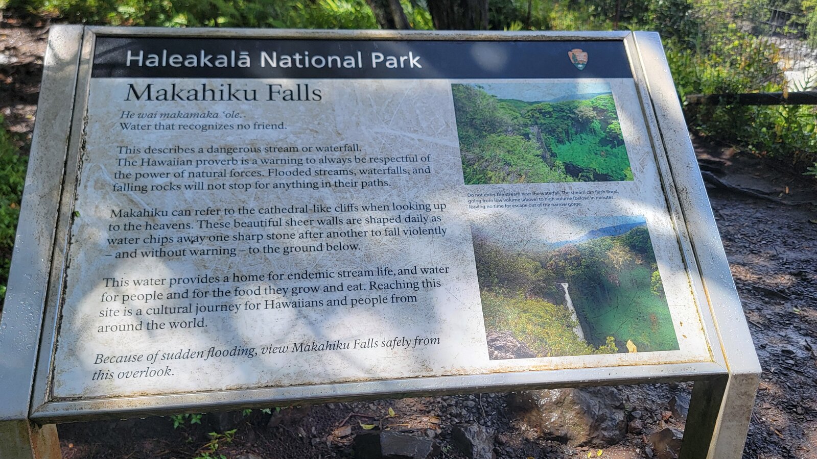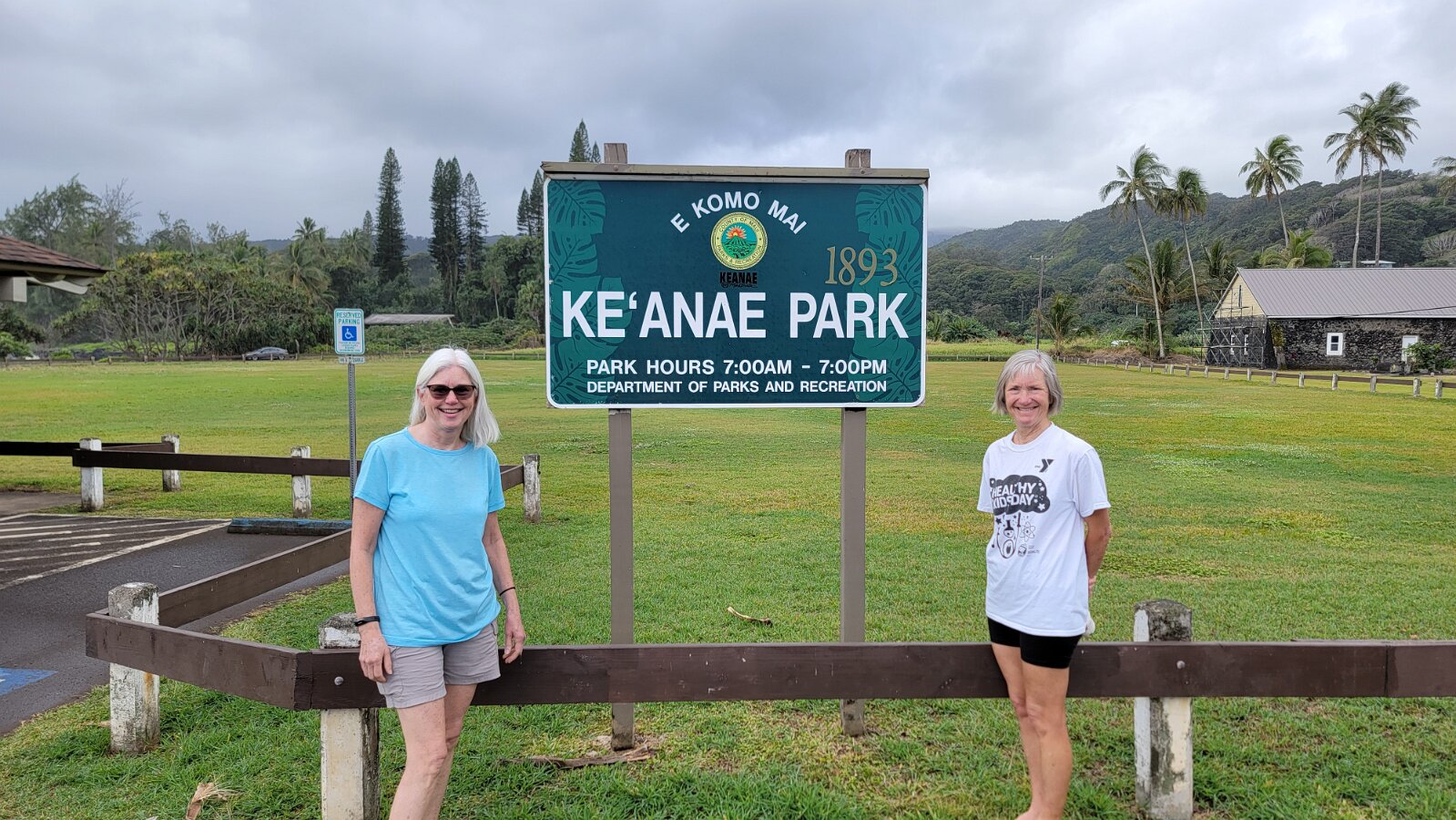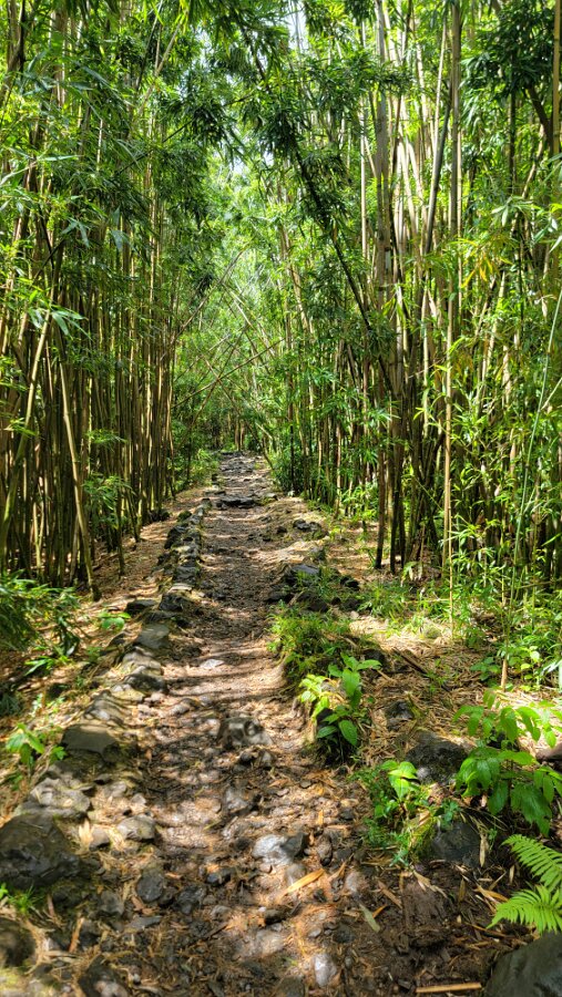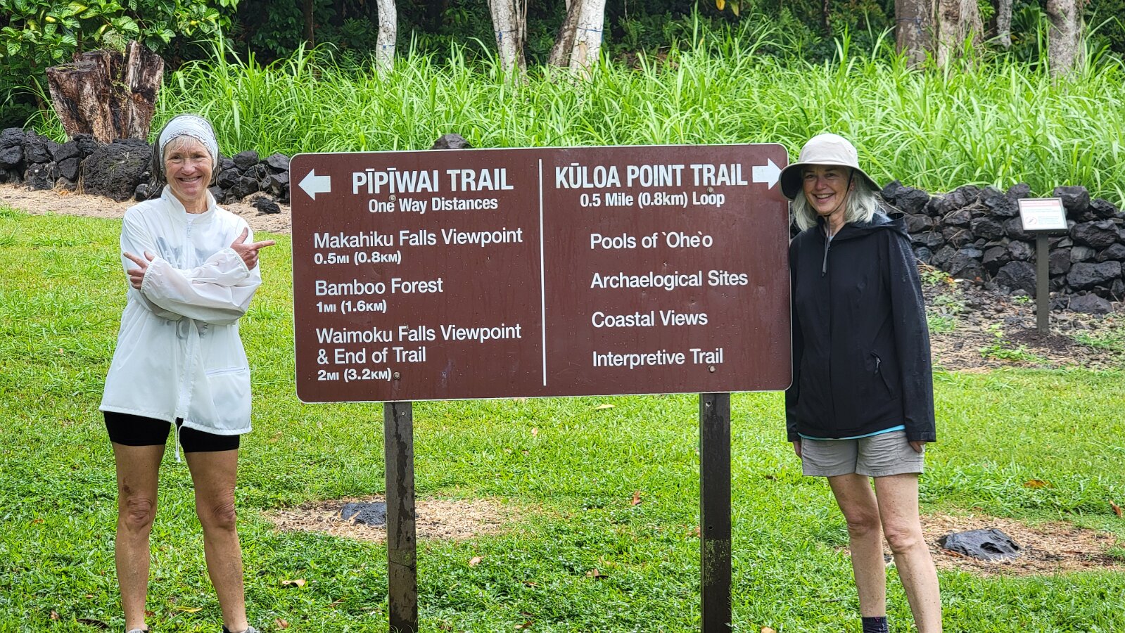 The Road to Hana!We got up early to get on the road! Took yogurt & granola with us to eatlater & caffeine! Hit the road at 7:00. Stopped at Costco to fill up withgas, then we were really on our way. We had a great drive! Not too muchtraffic. The road was not as crazy as our trip around the other half of Maui.Beautiful views & lots of water falls. There is very little parking by thefalls. Lots of “No Parking” signs. People are also not supposed to swim! It hasbeen a bit rainy so the water was really rushing! We planned to have our yogurtat the YMCA Camp, but we couldn’t find it. Close to where we though the Y was,we found Ke’anaePark. It was great! Beautiful views & a restroom! There were lots oftour vans there. Nora asked a guide about the Y camp. It is closed! We keptdriving thru Hana up to a Congregational Church where Charles Lindberg isburied! Beautiful spot. Big banyan tree in front of the church. We went back tothe HaleakalaPark Visitors Center at the SevenSacred Pools. Set off on what we thought would be a short hike. In therain! Did a loop to see the ocean & pools, then on to view the waterfall.At a sign along the way it said it was 2 miles to WaimokuFalls. After a brief discussion we forged on (of course). Saw another bigbanyan along the way. It was humid & occasionally rainy. The falls werespectacular! 400 ft! a great hike! 4.6 miles. Had lunch near the parking lot…thenit started to rain! Headed home. Uneventful drive. Went to Long’s for suppliesbefore going to the condo. I finished up the chicken soup by adding ourleftover veggie, pasta & chicken stuff along with the cauliflower rice webought. Late dinner & sleep!
